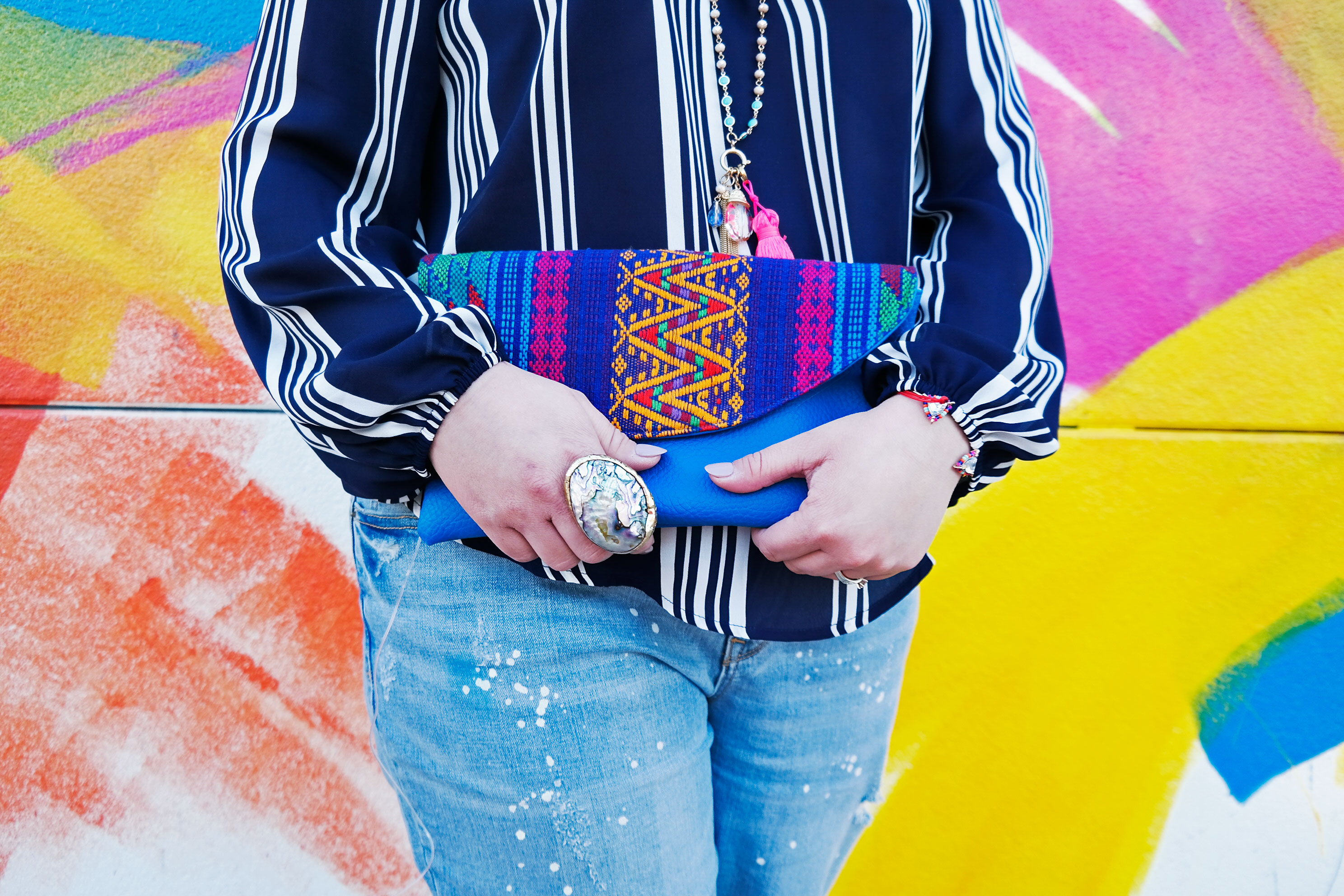 - Mix it up with pattern mixing. Try a striped shirt with a colorful bag like I did here.