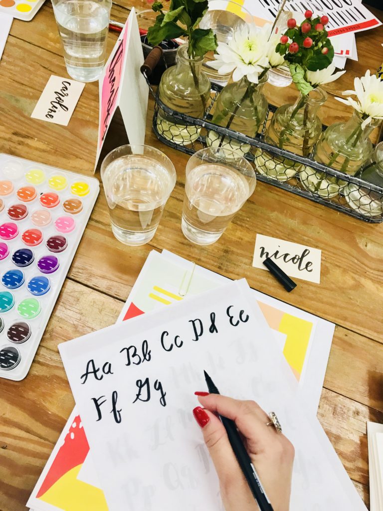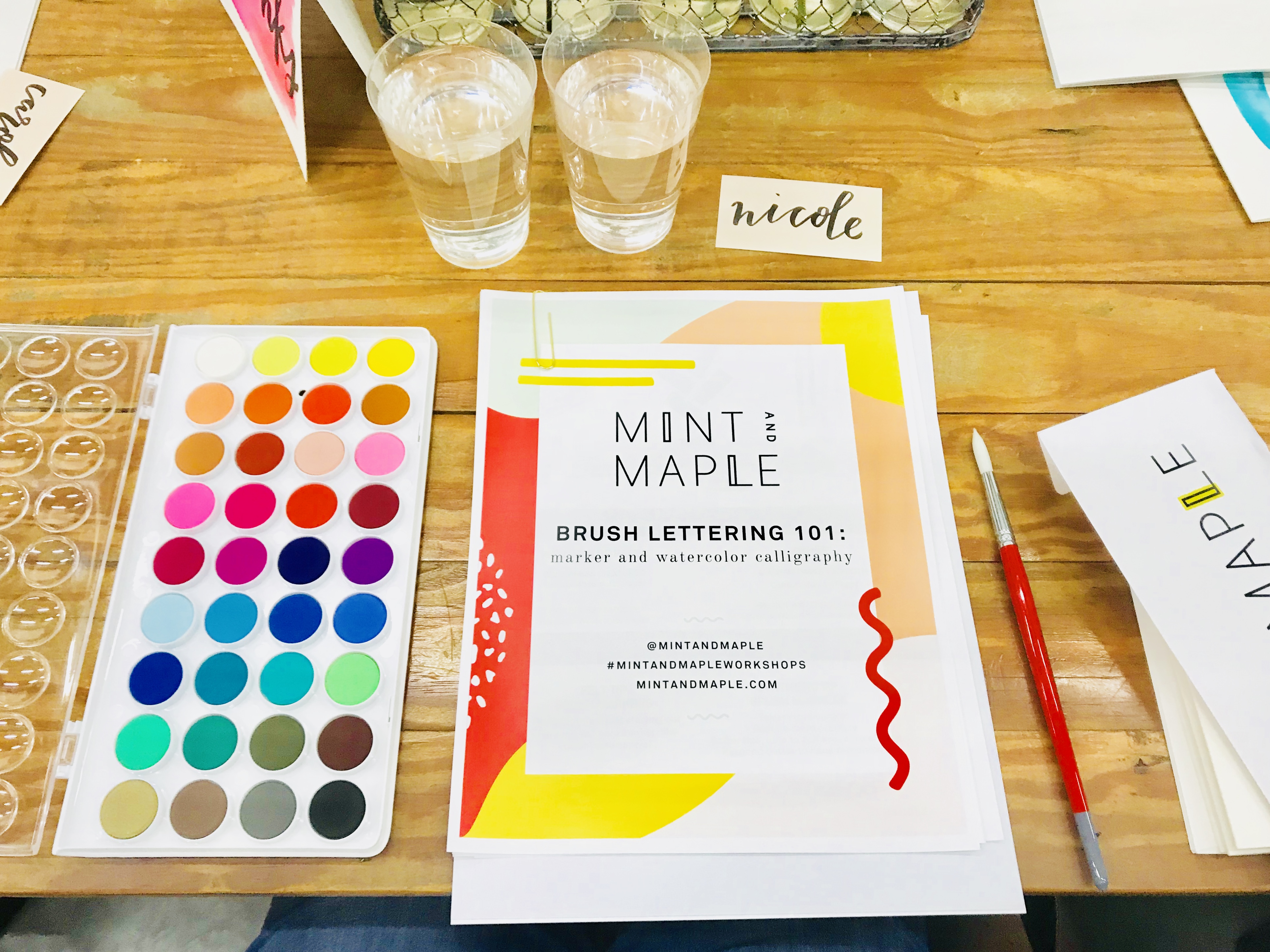 When I told my hubby that I was taking a brush lettering/calligraphy class he gave me an amused/confused look and told me “Wait, is it like when I used to be in school and the teacher made my practice my terrible handwriting?” I couldn’t help but laugh because I used to love those calligraphy notebooks. To be fair, I was the annoying kid in class with perfect handwriting that the teacher used as an example of beautiful cursive.But, because I’m on my cellphone all the time, I don’t write as much and I miss it. I’m from the generation that had to write out 5 page essays during final tests up until my hand cramped up. I can’t believe how “vintage” I’m making myself sound! Ha! I still like to carry a notepad or agenda and write everything down with ten different color inks. I still have a collection of pens, pencils and highlighters too and believe it or not, using these colors helps me remember stuff on my to-do lists because I’m very visual. Does that happen to anyone else? That’s why I was so excited when Mint and Maple invited me to take part in their Brush Lettering 101 class I didn’t now what to expect but I knew I was going to have fun because I love to write and paint.