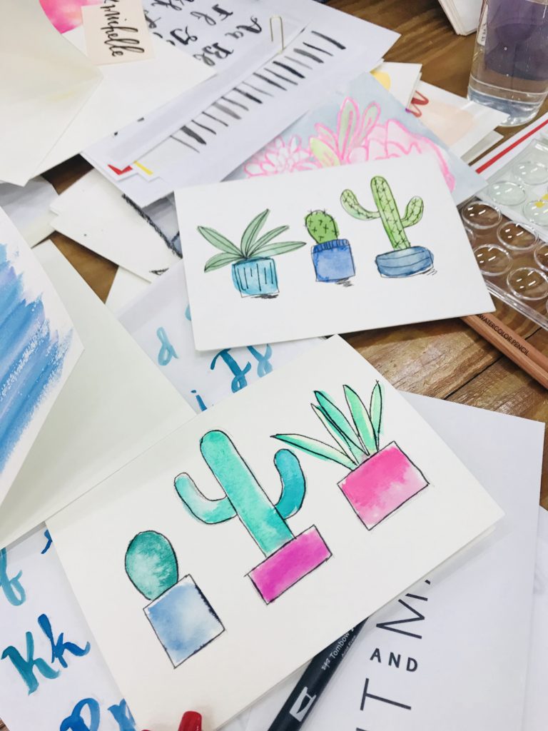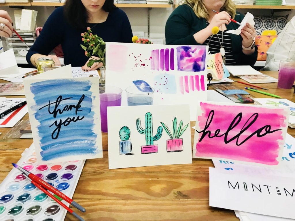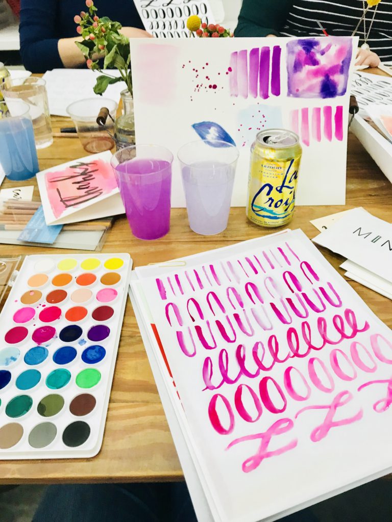 As soon as I arrived to class I noticed we were in the cutest stationery store (danger danger, I also used to collect stationery paper) in The Heights. I loved that I showed up and all supplies were included: 2 brushes, a watercolor pan set, a brush marker, paper, practice guides and even the promise of a completed project. You know what wasn’t included? A friend to sit with! I noticed all the class participants brought their girlfriend so I hope someone tags along with me next time.