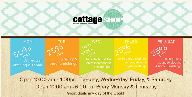 To score some serious deals check out the discount calendar at The Cottage Shop!